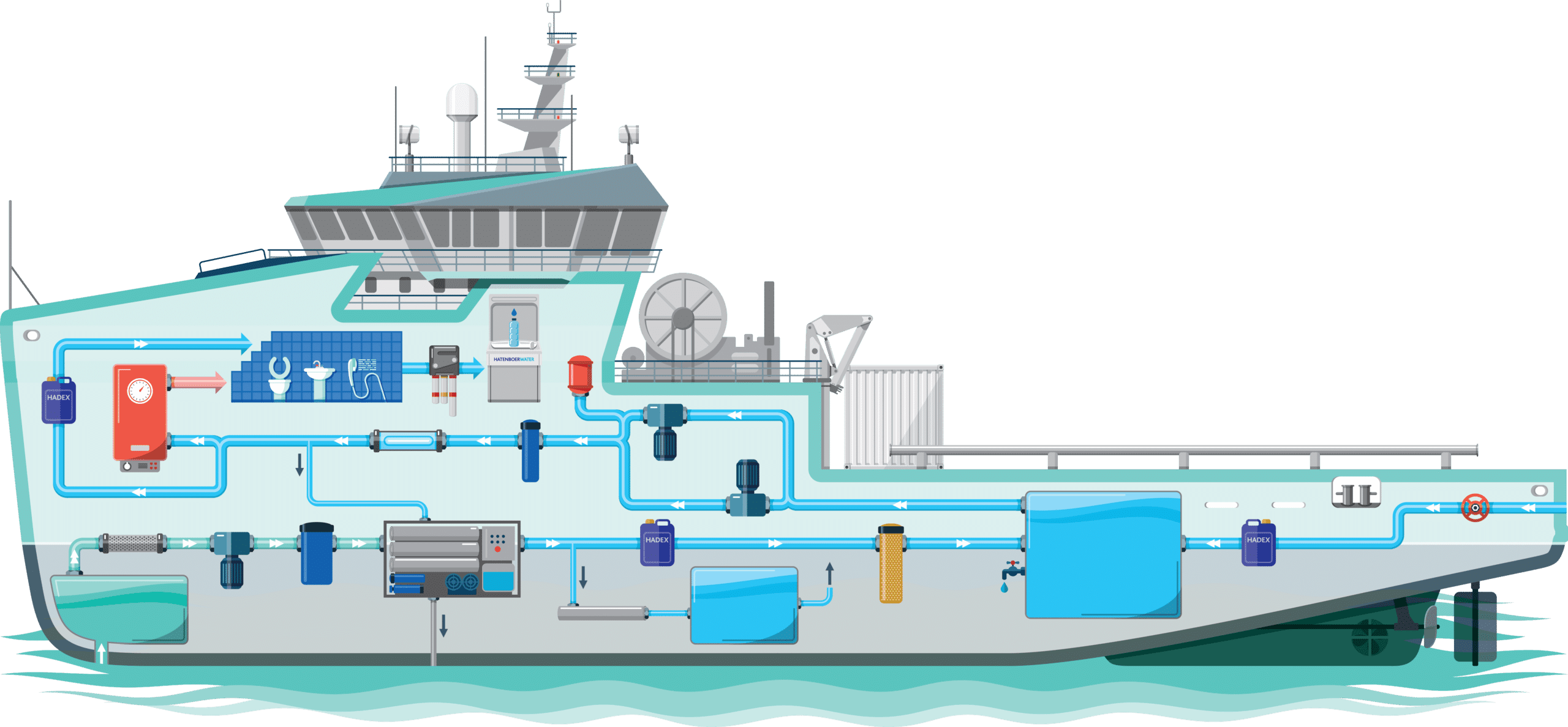 Hatenboer Water provides cold and hot water facilities, as well as disinfection equipment for the OFFSHORE WINDFARM CONSTRUCTION VESSEL.