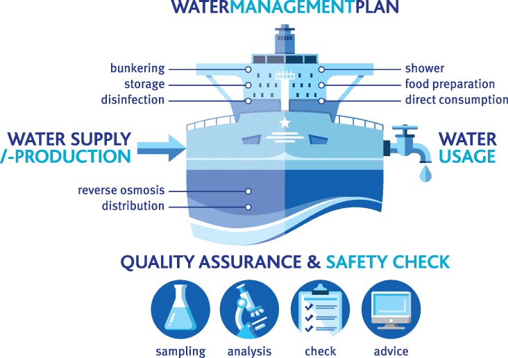 Our risk assessments include an inventory of possible risks for the quality of the complete water treatment on board. It is followed up by an improvement plan and a management plan.